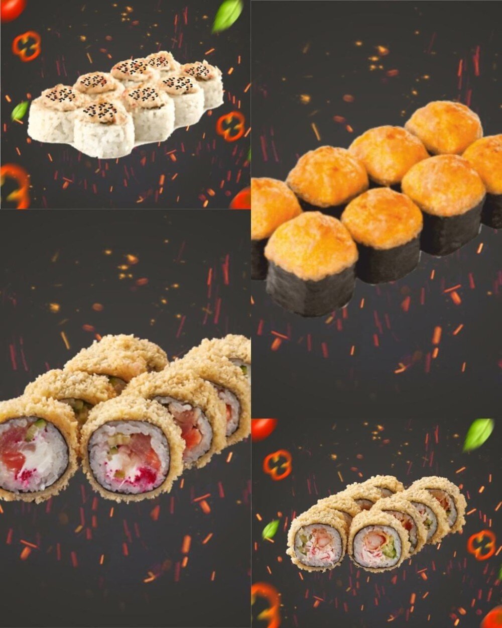 В сет входят 32 ролла: Чикен темпура (курица), Габман темпура (лосось), Запечённое облако (снежный краб) и Запечённые маки с креветкой. В наборе 2 порции соевого соуса, 1 порция васаби и имбиря.
