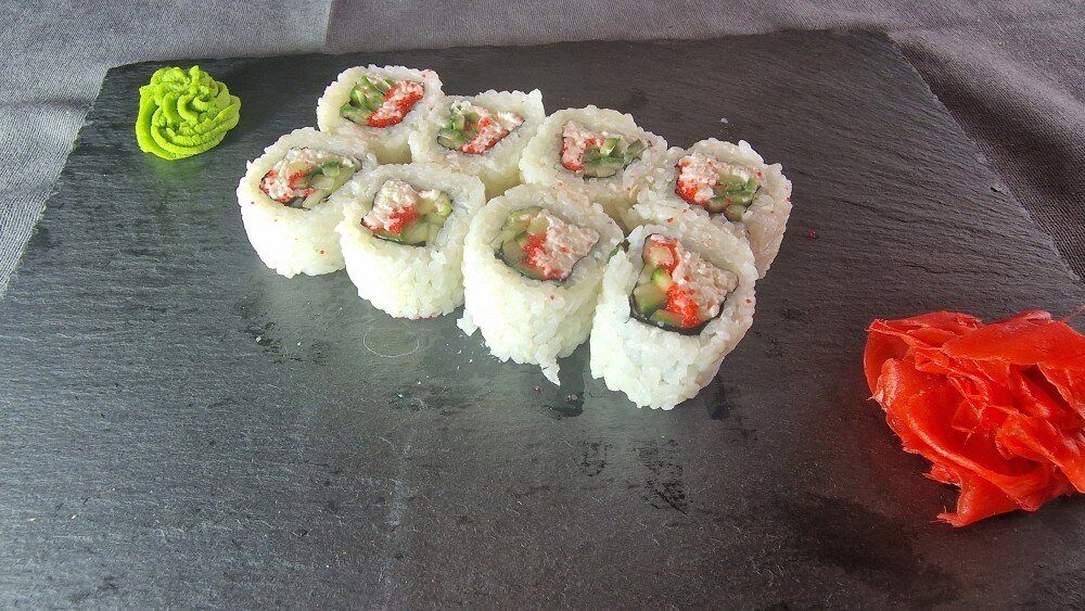 Краб, огурец, белый кунжут, рис, нори
